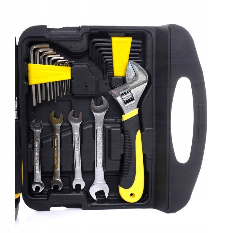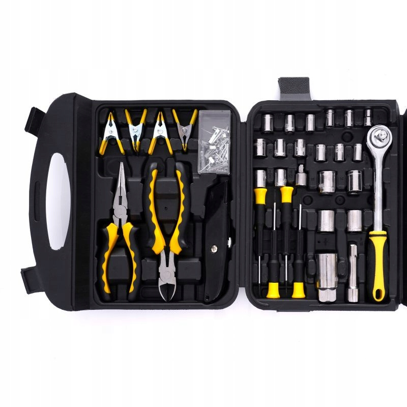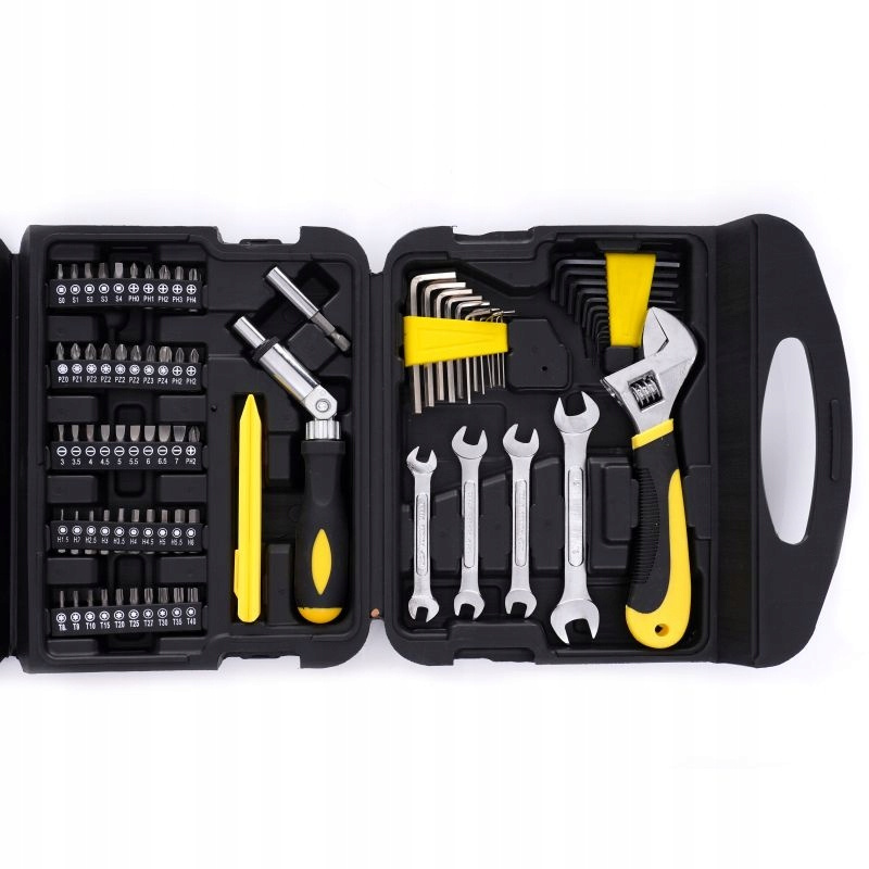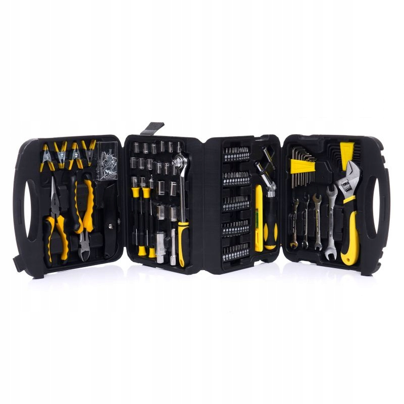 Każdy element wykonany jest z wysokiej jakości stali chromowo-wanadowej (CrV), która zapewnia odporność na korozję, ścieranie i wysokie temperatury. Zestaw obejmuje narzędzia takie jak klucze płaskie, nasadowe, szczypce, zaciski, imbusy, grzechotkę, wkrętaki, bity i wiele więcej – wszystko, co potrzebne w warsztacie samochodowym, remontowym czy firmie produkcyjnej.