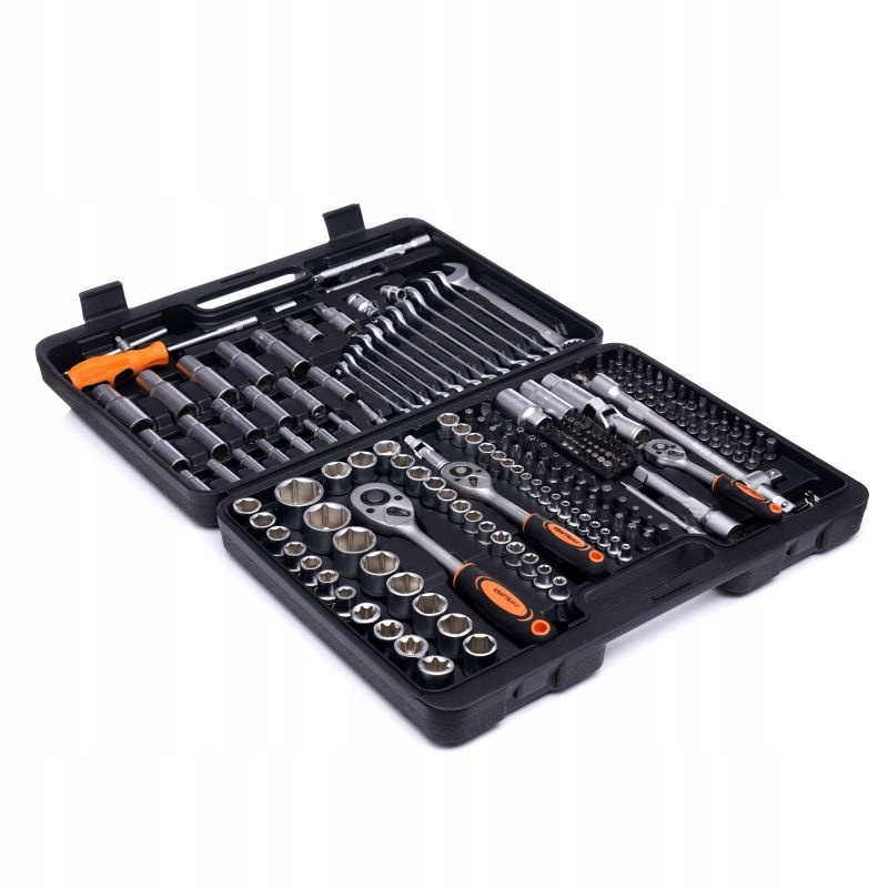 W skład zestawu wchodzą m.in. nasadki, klucze płasko-oczkowe, klucze imbusowe, grzechotki i końcówki wkrętakowe. Każdy element został starannie zaprojektowany, aby spełniać najwyższe standardy wytrzymałości i precyzji. Poręczna walizka z trwałych tworzyw sztucznych pozwala na łatwe przechowywanie i organizację narzędzi, co minimalizuje ryzyko zgubienia poszczególnych elementów.